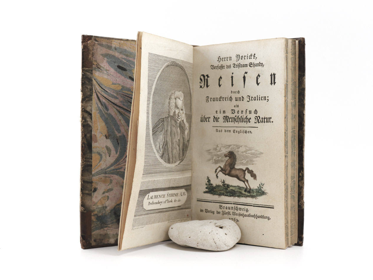 Zustand 3, Leder brüchig, im Rückenfalz stellenweise angeplatzt, Ecken und Kanten stärker bestoßen, teilweise etwas stockfleckig, Lesebändchen im 2. Band ausgerissen.