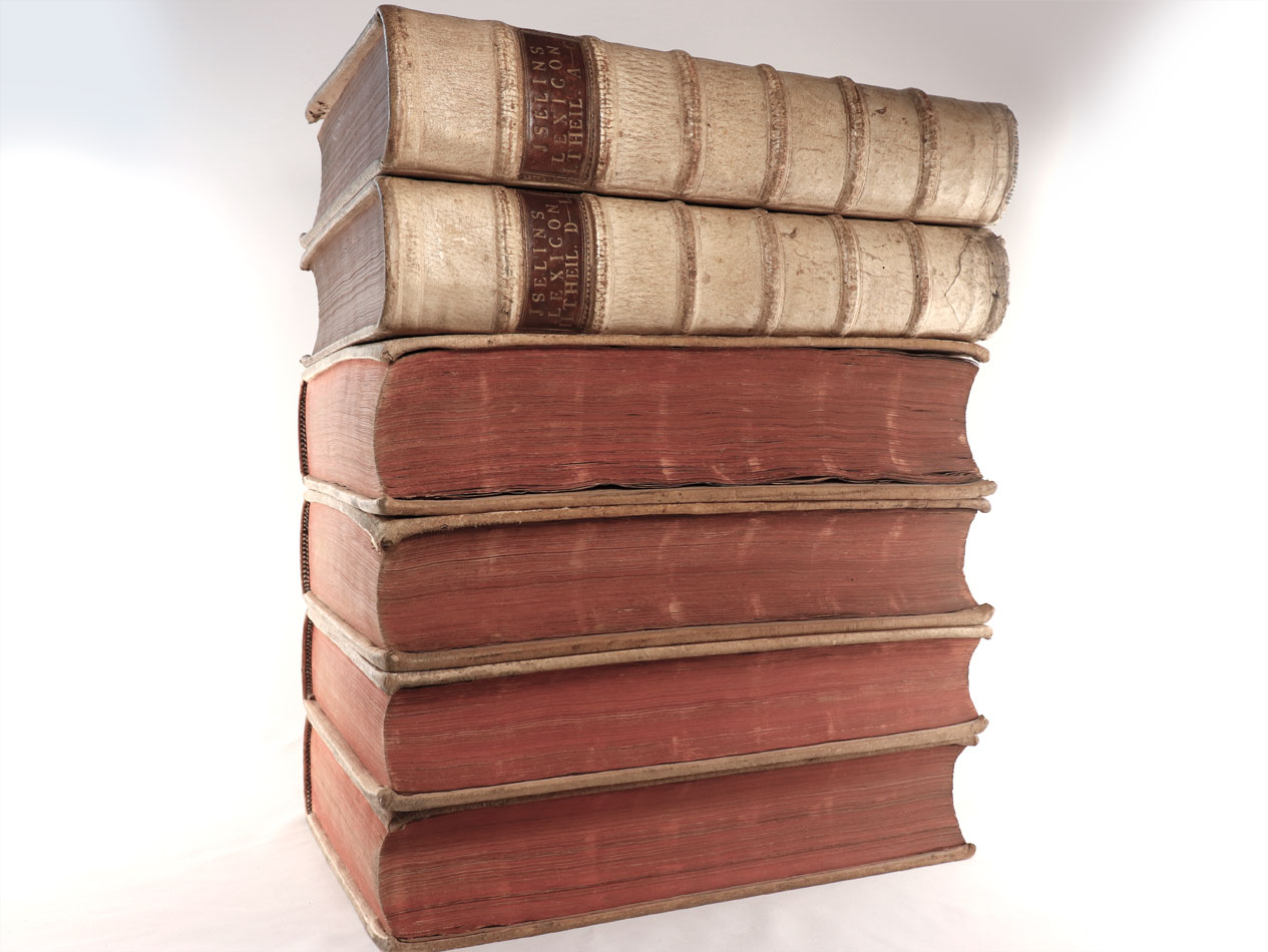 in welchem das Leben/die Thaten/und andere Merckwürdigkeiten deren Patriarchen / Propheten / Apostel / Vätter der ersten Kirchen / Päbsten / Cardinälen / Bischöffen / Prälaten / vernehmer Gelehrten / und andere sonst in denen Geschichten berühmter Männern und Künstlern / nebst denen so genannten Ketzern; … Erster Theil A-C, Zweyter Theil, Dritter Theil K-Q, Vierdter Theil R-Z; Supplement zu dem Baselischen allgemeinen Historischen Lexico in welchem das Leben und die Thaten der Patriarchen … und endlich die Beschreibungen der Kayserthümer / Königreiche / Fürstenthümer / freyer Staaten, Landschaften, Insuln, Städte, Schlösser, Klöster, Gebürge, Flüsse und so fort, vorgestellet werden, Von Jacob Christoff Beck Und August Johann Burtorff, Erster Theil Basel, Johannes Brandmüller Aelter seel. Erben, 1742 und Zweyter Theil. Basel, Johannes Christ sel. Wittib, 1744. 6 Bände komplett.