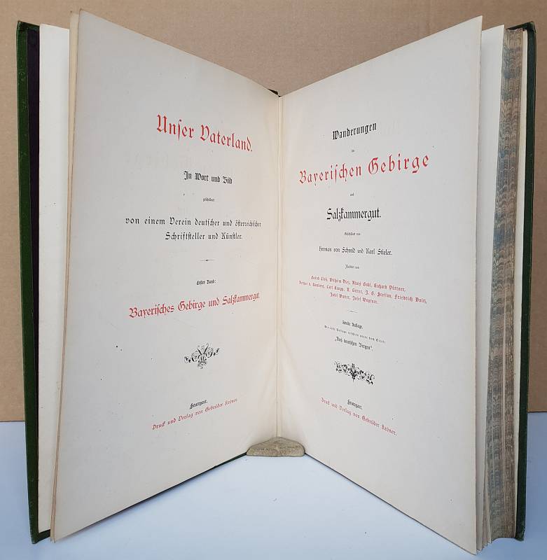 Die erste Auflage erschien unter dem Titel "Aus deutschen Bergen". Nebehay-Wagner 758.1. Inhalt u.a.: Karl Stieler: An der Zugspitze. / An den Walchensee. / Durch die Jachenau und Länggries. / Ein Rundgang um den Tegernsee. / Dorf Kreuth und Wildbad. / In der Kaiserklause. / Am Spitzing. / Der Schliersee. / Fischbachau und Bayerischzell. / Nach Miesbach. / Der Chiemsee. / Zum Königsee.