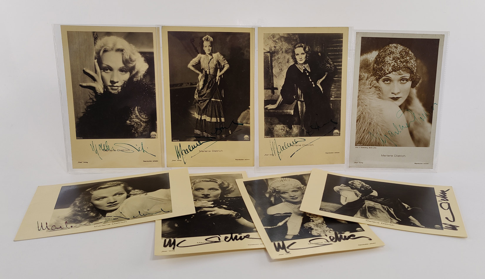 33 Filmprogramme, davon 1 Stummfilmprogramm ("Ich küsse Ihre Hand Madame"), 2 Filmzeitschriften mit Rollenbild, 1 S/W-Szenenfoto 17x21 cm , 47 Autogrammpostkarten, davon 5 mit frühen Signaturen; 1 Ross-Postkarte auf Untersatzkarton, dieser mit früher Signatur in grüner Tinte, 3 Ross-Postkarten mit Autogramm in schwarzem Filzstift, 3 Pressefotos der Motion Picture Export Association (etwas beschnitten) mit Signatur in Tinte, 1 Aushangfoto zu "Engel der Gejagten" von Fritz Lang (leicht beschnitten) mit Signatur in Tinte, 23 Fotoporträts (Abzüge der 60er-Jahre) mit Autogramm, davon 5 in Tintenstift, die anderen in Filzstift (davon 3 in Gold u. 2 in Silber), 1 spätere Postkarte mit Autogramm in Silberstift, 1 Farbfoto 10x15 cm zusammen mit ihrer Tochter Maria Riva, von Dietrich in Silberstift signiert mit Zusatz "+ Maria Sieber", Dietrichs Tochter, 1 Sonderpublikation der Zeitschrift "Mein Film": Marlene Dietrich. Die Geschichte einer Karriere. 8°, 30 S., zahlreiche Illustrationen, 1 Tageszeitung von 1948 mit Artikel zu den neuerlichen filmischen Erfolgen Dietrichs, 1 Tageszeitung zu Dietrichs Auftritt in Paris 1959.