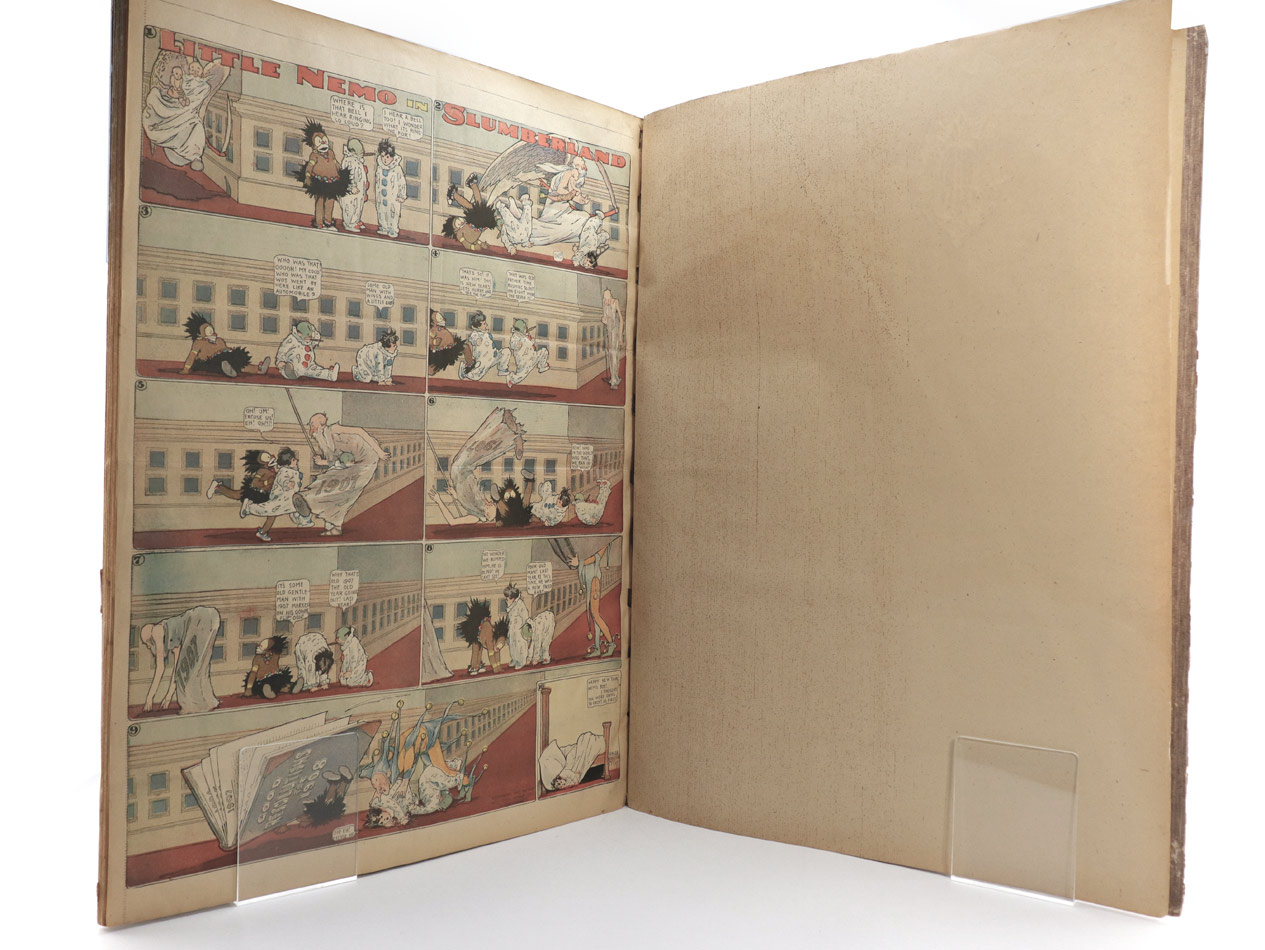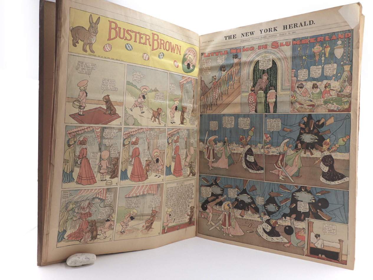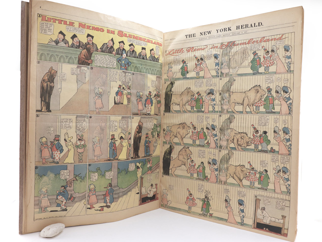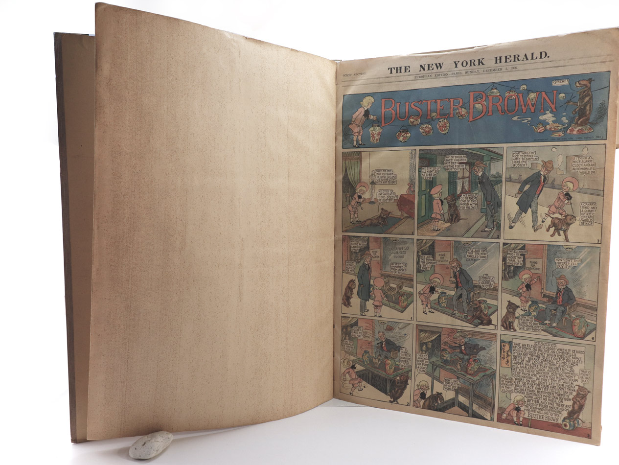 additional in each number: Little Nemo in Slumberland by Winsor McClay. 30 fullside comics in colour at the second page of each copy of the comic section. Little Nemo in Slumberland“ erschien von 1905 an regelmäßig in der Sonntagsbeilage des New York Herald. 1911 wechselte McCay in die Pressegruppe des Pressemoguls William R. Hearst, wo sein Werk bis 1914 unter dem Namen "In the Land of Wonderful Dreams“ erschien. 1924 bis 1926 gab es ein Comeback für Little Nemo in der New York Herald Tribune. Der Zeitungscomic Buster Brown erschien ab 1902 im New York Herald. Als Outcault 1906 zu den Hearst-Zeitungen wechselte, kam es zum Rechtsstreit zwischen dem Herald und Hearst. Das Gericht entschied, dass Outcault als Schöpfer zwar seinen erschaffenen Charakter mitnehmen konnte, dass der titelgebende Name aber beim Herald verbleiben musste. So erschien Buster Brown weiter beim Herald bis wahrscheinlich 1911, während Outcaults Version bei Hearst bis 1921 erschien. In der hier vorliegenden Dezember-Nummer v. 1906 ist "Buster Brown" auf der ersten Seite des Wochenendcomics, ab der ersten Jännernummer 1907 nimmt diesen Platz "Little Nemo" ein, was vermutlich den Wechsel Outcaults zu Hearst widerspiegelt. Beilage: "Winsor McCay: Little Nemo. Little Nemo in Slumberland - Little Nemo in the Land of Wonderful Dreams - 1905 - 1914; mit einer Einleitung von Bill Blachbeard. Benedict Taschen Verlag, Köln, 2000. Folio, 428 S. ZUSTAND -1.