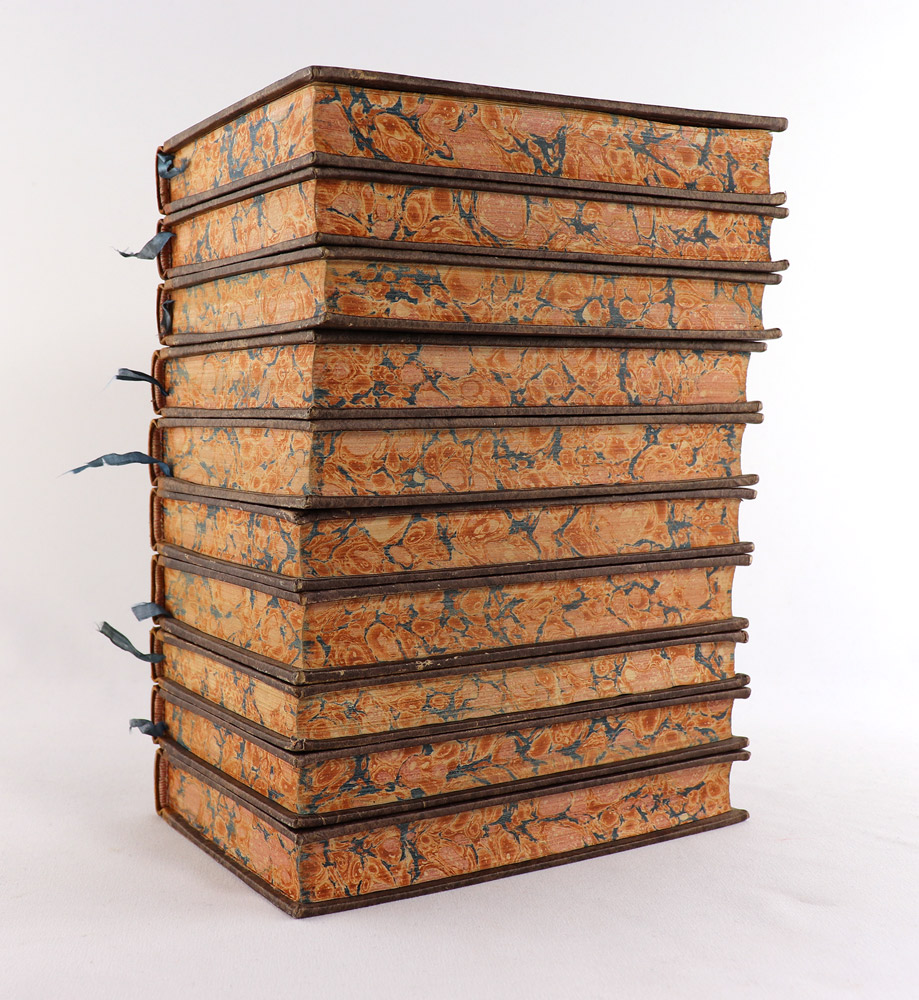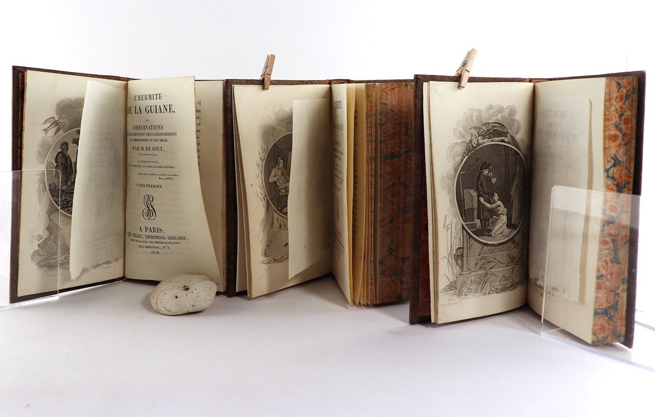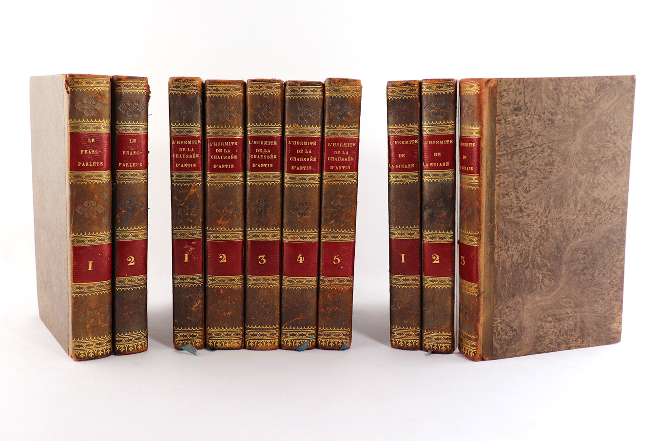 Kl.-8°, 332 S., 2 Bl., 396, 356, 372, 348; 364, 336; 398, 334, 345, 5 frontispices et 6 figures pour les 5 volumes de "L'Hermite de la Chaussée-d'Antin" ; 2 volumes, illustrés d'un titre gravé et d'un frontispice, pour "Guillaume", 3 volumes avec 3 frontispices et 2 figures pour "L'Hermite de la Guiane". marmorierte Halblederbände der Zeit mit goldgeprägten Rückentitleln und Bandnummerierungen auf roten Schildchen, goldgeprägten Rückenverzierungen, dreiseitige marmorierte Schnitte und Lesebändchen.