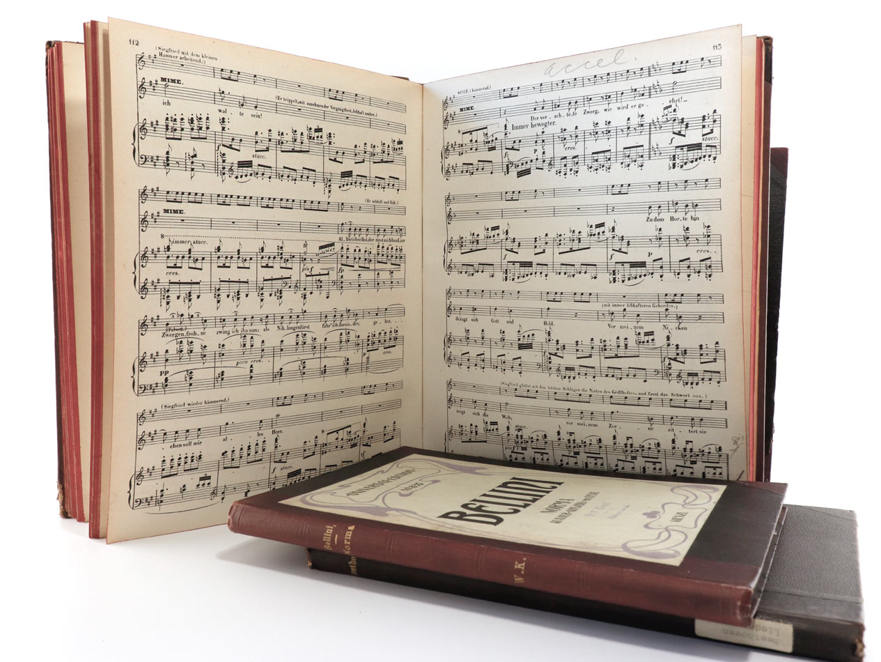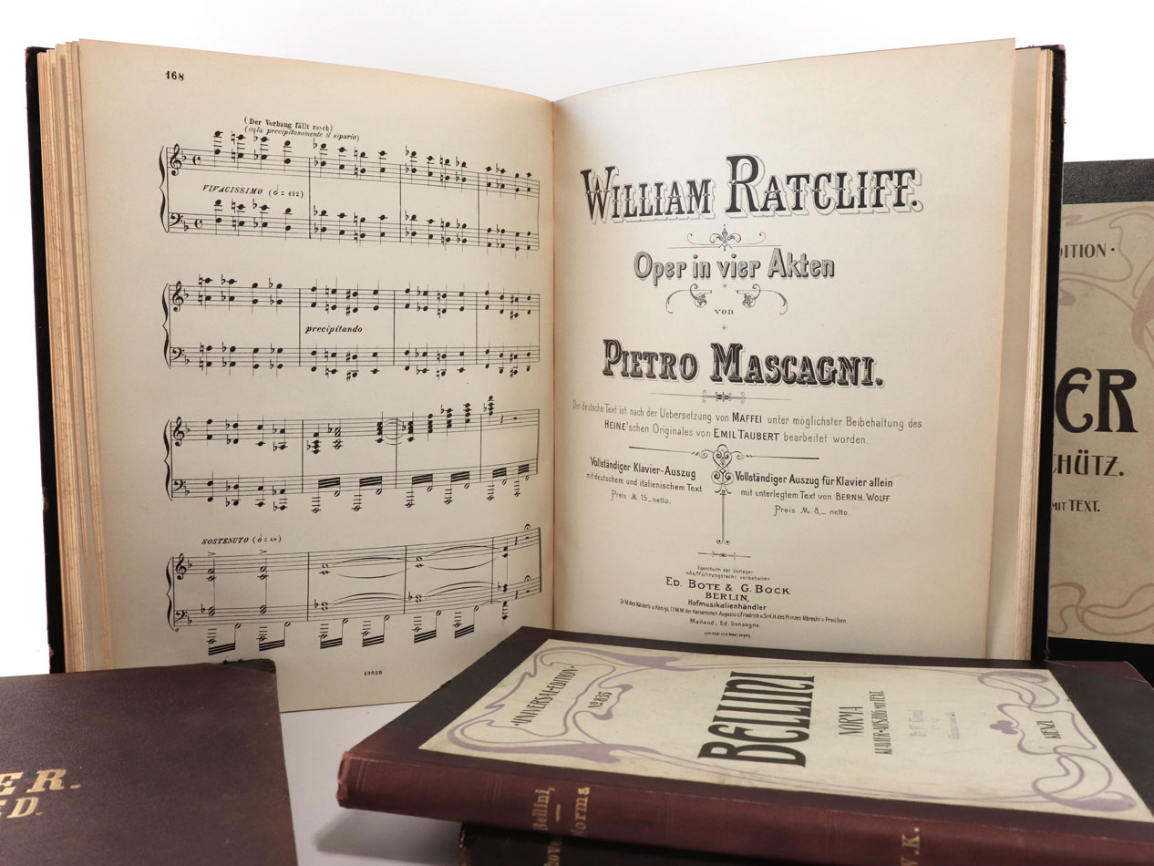1: Siegfried von Richard Wagner. Vollständiger Klavierauszug von Karl Klindworth. Mainz, B. Schott´s Söhnen, 299 S., 4°, schwarz/bordeauxroter Original-Halblederband mit goldgeprägtem Deckel- und Rückentitel, dreiseitiger Rotschnitt. (Deckel vorne unten in Goldprägung "W. Kienzl", Vorsatz mit Eignerstempel mit Grazer Adresse Glacisstrasse 65, Titel Eintrag in Tinte "Dr. W. Kienzl -28. V. MDCCCLVIII u. Zusatz in Bleistift "von Tante Berta", Noten mit einigen Anstreichungen u. Anmerkungen in Bleistift oder Farbstift. // 2: Cavalleria Rusitcana (Sicilianische Bauernehre) Melodram in einem Aufzug. Musik von Pietro Mascagni. Vollständiger Clavierauszug mit deutschem und italienischem Text. (Wiener Bearbeitung.). Berlin, Ed. Bote & G. Bock. 4°, III, 168 S., schwarzer Original-Halblederband mit goldgeprägtem Deckel- und Rückentitel, dreiseitiger marmorierter Schnitt. Vorsatz mit Grazer Eignerstempel, Titel Eintrag in Tinte "Dr. Wilh. Kienzl - Erhalten vom Verleger aus Berlin im März 1898". Leinenbezug etwas wellig. Miteingebunden: William Ratcliff. Oper in vier Akten von Pietro Mascagni. Vollständiger Clavierauszug mit deutschem und italienischem Text. 4°, I, 203 S. // 3: Norma. Tragische Oper in 2 Aufzügen von V. Bellini. Klavierauszug mit Text. Wien, "Universal-Edition" No 835. (1904). 4°, 187 S., bordeaux/schwarzer Original-Halbleinenband mit auf Deckel aufkaschiertem Titelblatt und goldgeprägtem Rückentitel, dreiseitiger marmorierter Schnitt. Deckeltitel u. Titel mit Grazer Eignerstempel, Titel mit Eintrag in Tinte "Erschienen am 30. Juli 1904. Dr. W. Kienzl". // 4: Der Freischütz. Romatische Oper in 3 Aufzügen von F. Kind. Musik von C. M. von Weber. Klavier-Auszug mit Text. Revidiert von Dr. Wilhelm Kienzl. Wien, Universal-Edition No 224, 130 S., 1 Bl., bordeaux/schwarzer Original-Halbleinenband mit auf Deckel aufkaschiertem Titelblatt und goldgeprägtem Rückentitel, dreiseitiger marmorierter Schnitt. Vorsatz fremder Eignereintrag, Titel Stempel "Recensions-Exemplar" u. Eignereintrag von Kienzl in Tinte. // 5: Sämmtliche Lieder für eine Singstimme mit Pianofortebegleitung von L. van. Beethoven. Leipzig, C. F. Peters, 4°, 191 S., illustriertes Titelblatt, schwarzer Original-Halbleinenband mit goldgeprägtem Rückentitel und aufkaschiertem Rückentitelschildchen, dreiseitiger marmorierter Schnitt. Vorsatz u. Titel mit Grazer Eignerstempel u. Eintrag in Tinte "Dr. Wilh. Kienzl - Erhalten von Lili (=Gattin) zum Geburtstage 1901. Anstreichungen in Bleistift im Inhaltsverzeichnis.