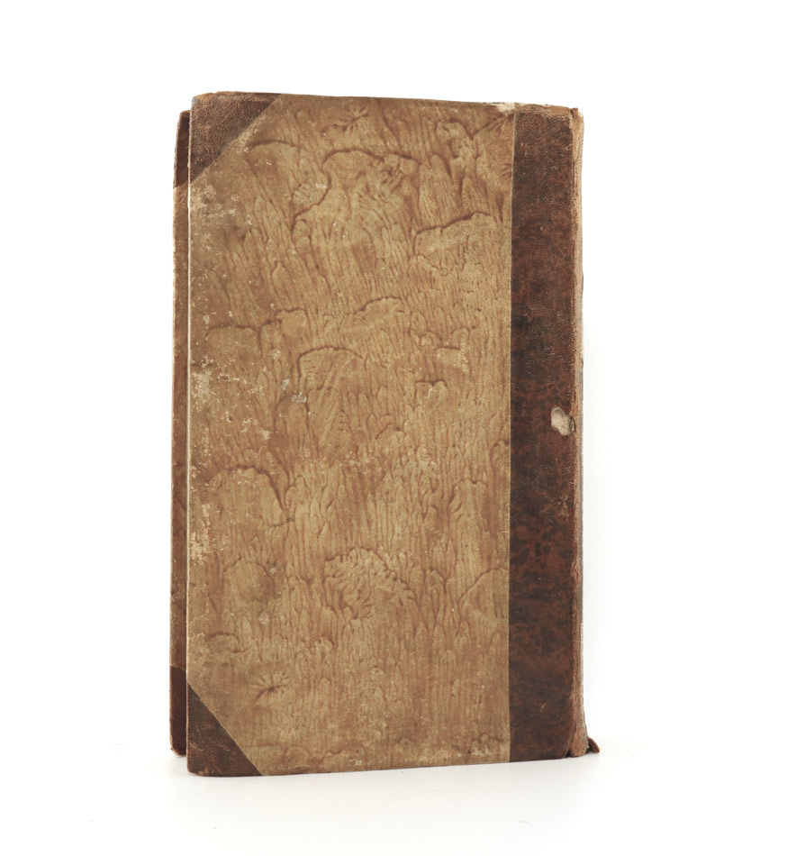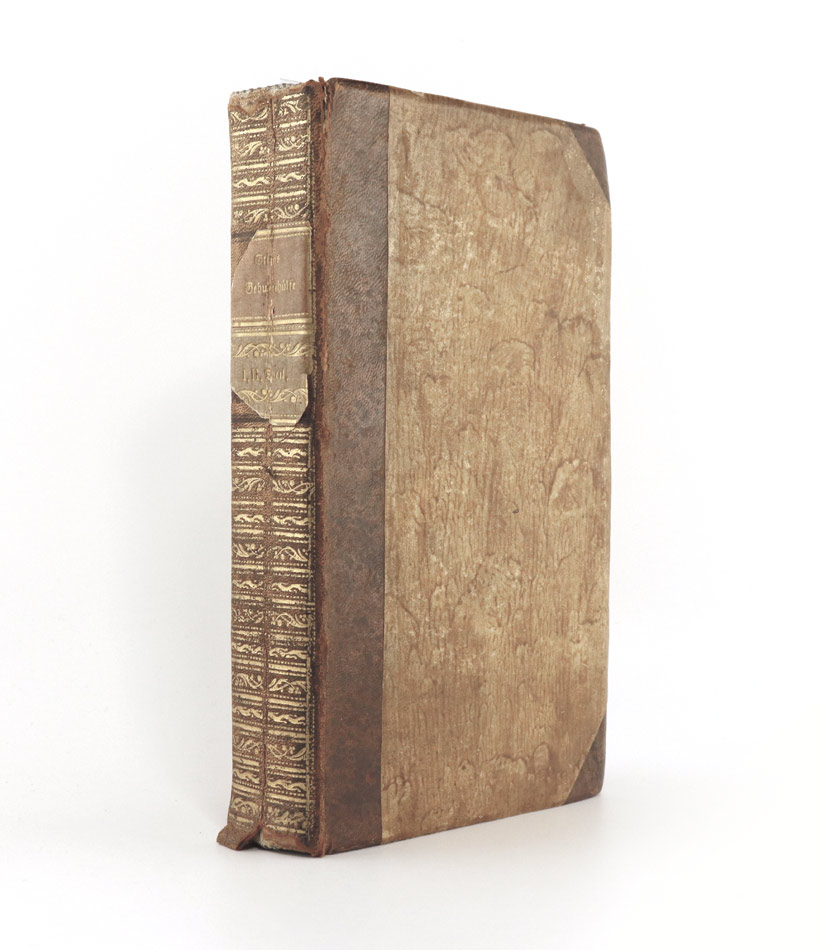 Zustand 3, Rückenleder an Kopf u. Fuß Randverluste, mittigen Bug durch Verklebung mit Buchblock u. hinten Insektenfraßstelle, Rückenschild Randverluste, fliegendes Blatt neuerer dezenter Eignerstempel, Schnitt unten alter Tintenfleck, Buchblock in guter Erhaltung.