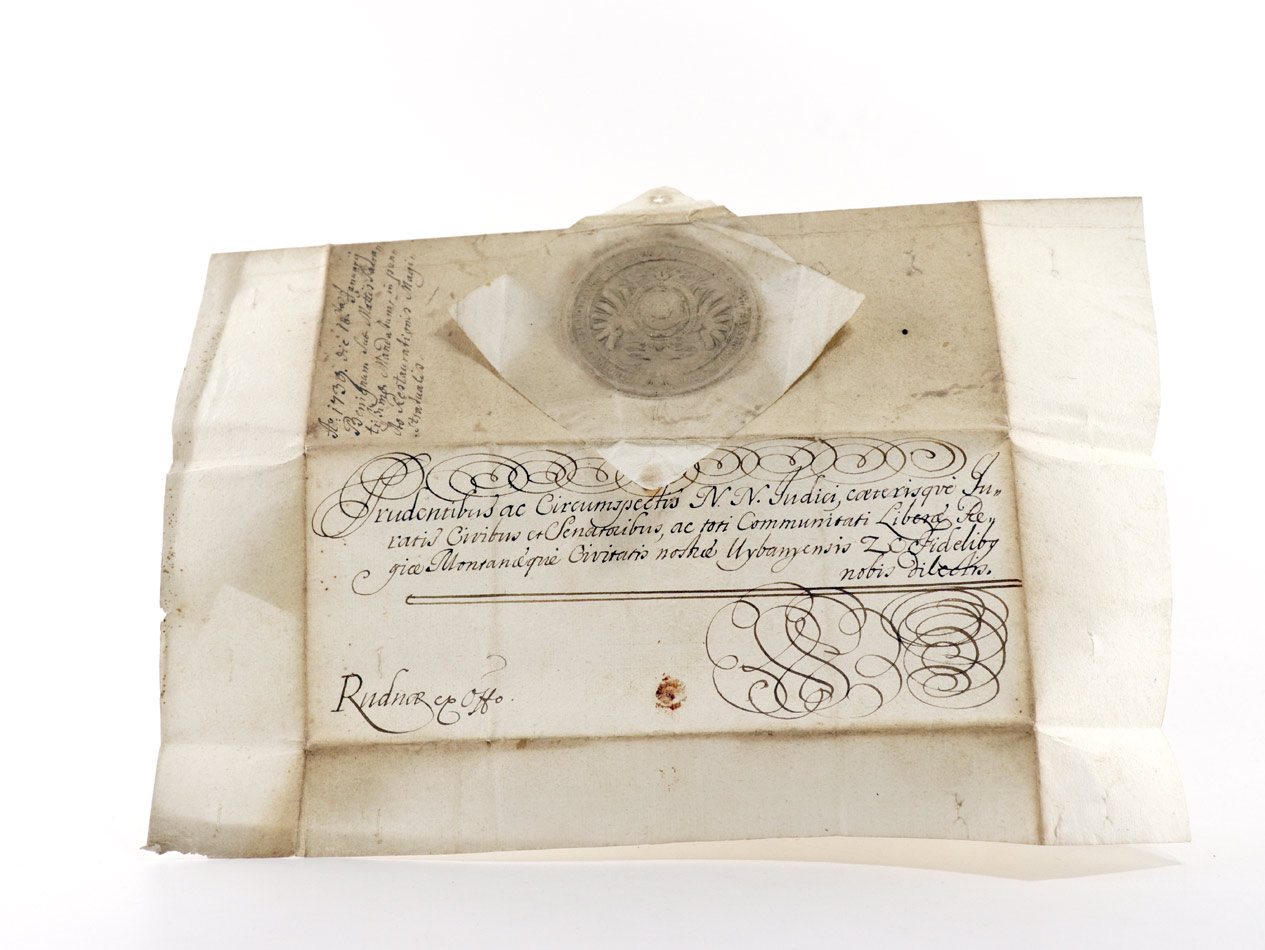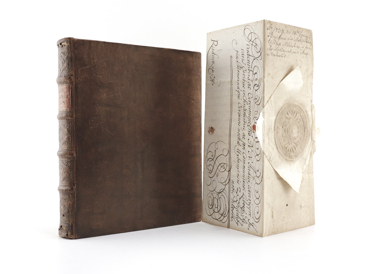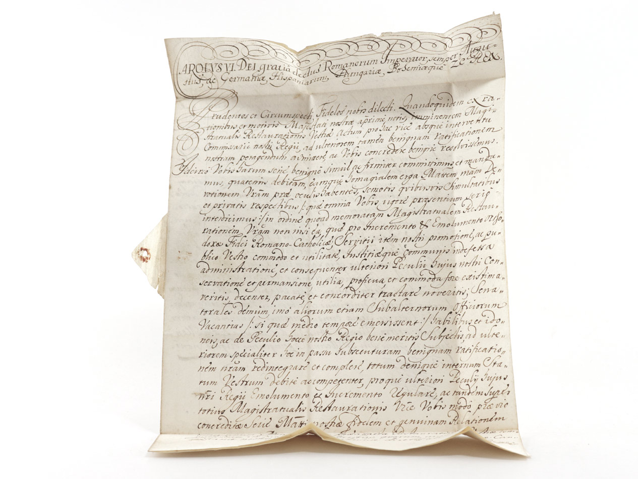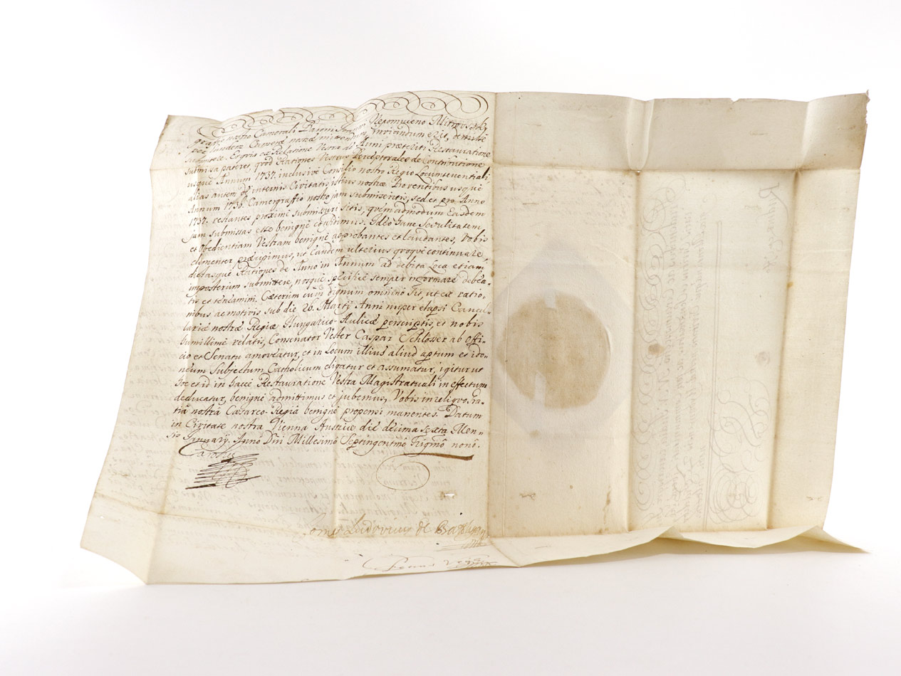 VD18 14891085-003. Holzmann-Bohatta IV, 3251. Beiliegend ex offo-Brief ("Rudnae ex offo", Rudno nad Hronom liegt in der Nähe von Nová Bana [deutsch Königsberg, ungarisch Újbánya, lateinisch Regiomontum] in der Mittelslowakei) mit Papiersiegel an die Beamten von Königsberg mit eigenhändiger Unterschrift von Kaiser Karl V. bezüglich der Einsetzung des Mineralogen Johann Nepomuk Freiherr von Mittrowsky und Nemischl (* 1704; † 3. Juni 1760) als niederungarischer Oberst-Kammergraf.