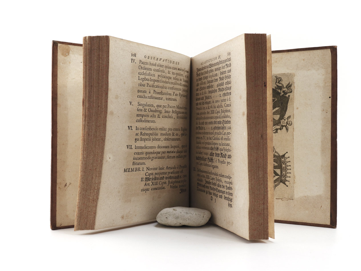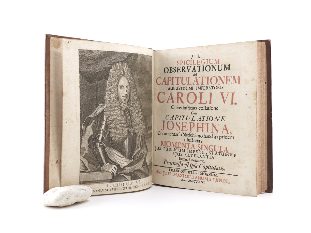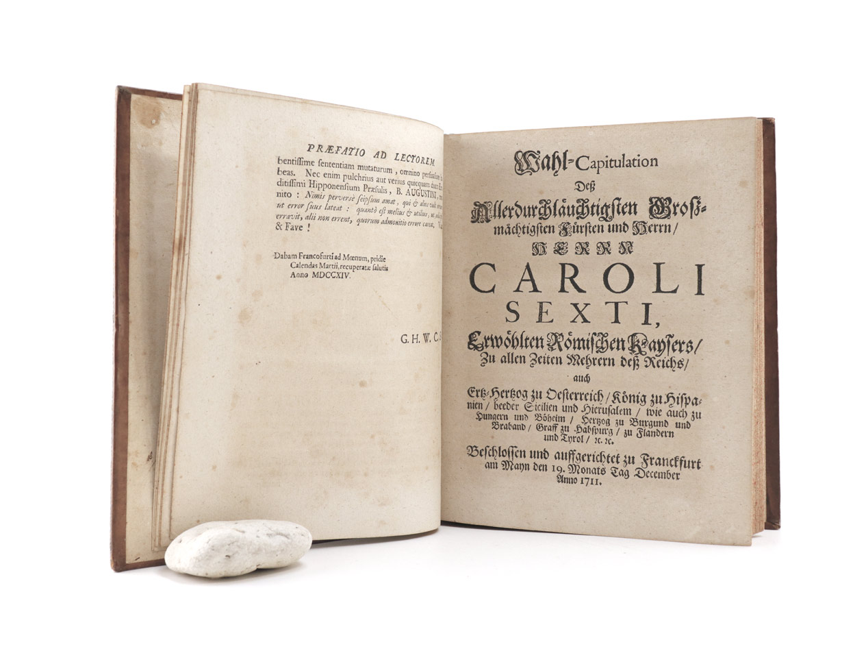 ...em illustrata, momenta singula jus publicum Imperii, statumve ejus alterantia ingenuè notantur.Wahl-Capitulation Deß Allerdurchläuchtigsten Groszmächtigsten Fürsten und Herrn, Herrn Caroli Sexti Erwöhlten Römischen Kaysers, Zu allen Zeiten Mehrern deß Reichs, auch Ertz-Herzog zu Oesterreich, König zu Hispanien, beeder Sicilien und Hierusalem, wie auch zu Hungern und Böheim, Hertzog zu Burgund und Braband, Graff zu Habspurg, zu Flandern und Tyrol, [et]c. [et]c. Beschlossen und auffgerichtet zu Franckfurt am Mayn den 19. Monats Tag December Anno 1711. + AUTOGRAPH Kaiser Karl VI. -