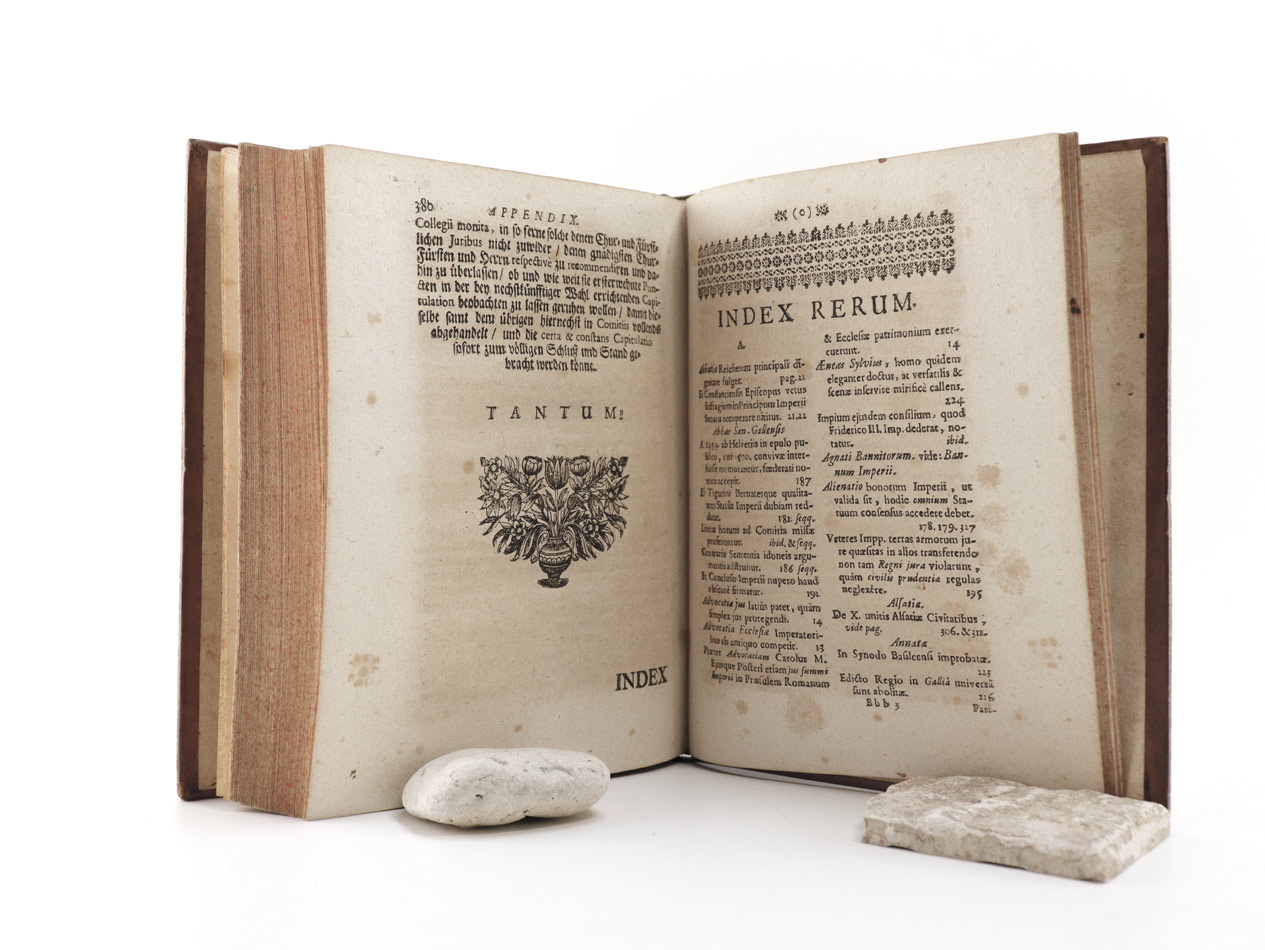 Guter Zustand, Vorsatz etwas leimschattig, Fliegendes Vorsatz recto Nummer in alter Tinte, Kupfer 3 mm Tintenfleck, hinterer Spiegel Exlibris of Aloys Thomas Raimund Graf Harrach (1669-1748) mit dem gestürzten Wappen Thannhausen ("Hinc occidit") und dem vereinigten Wappen Harrach-Thannhausen ("Inde resurgit").