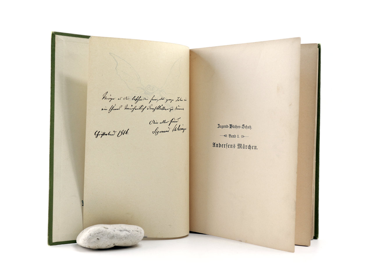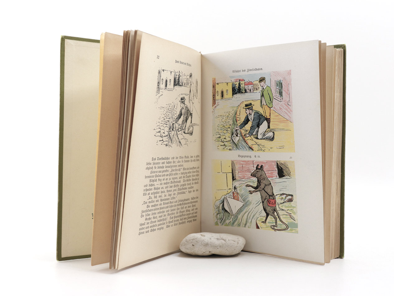 8°, 62, 63, 64, 64, 64, 64 S., 676 Illustrationen, je Band 3 farbige Tafeln, schwarz/silber geprägter illustrierter Original-Leinenband, aufgedruckte Nummer 952 am Deckel rechts unten, illustrierte Vorsätze, handschriftliche Widmung in Tinte am fliegenden Vorsatzblatt.