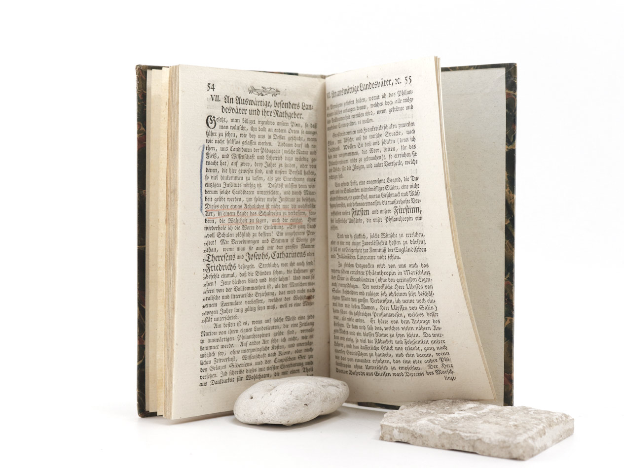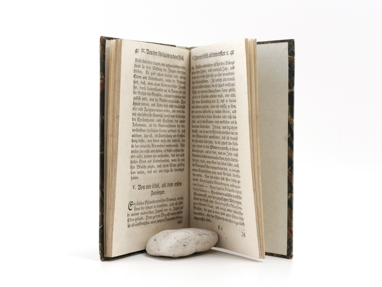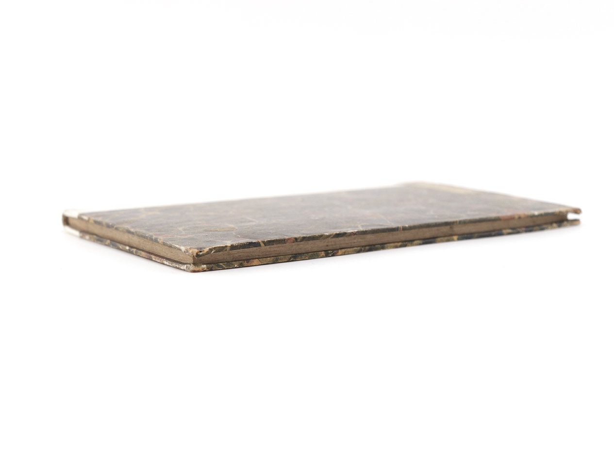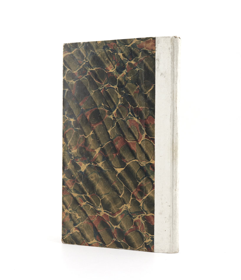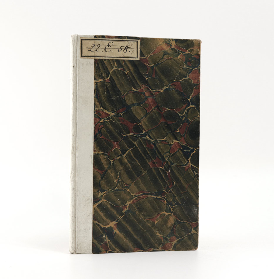 Kl.-8°, 56 S., 2 Bl., marmorierter Pappband mit Pergamentpapierrücken der Zeit, Standsnummerschildchen am Deckel.