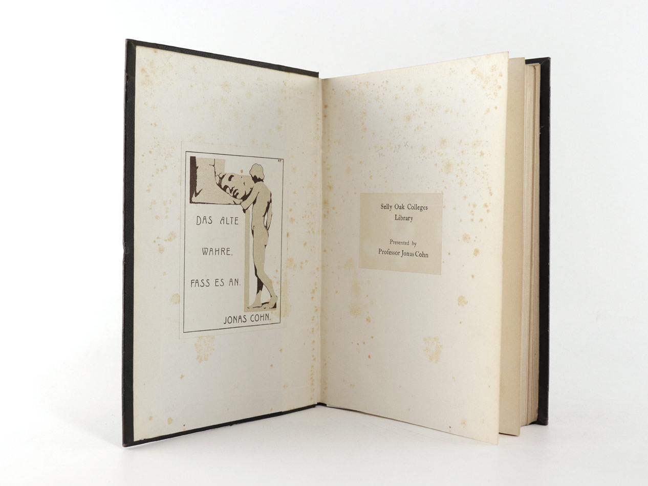Zustand -2, handschriftliche Standnummer am Rücken, Spiegel Exlibris von Jonas Cohn, fliegendes Vorsatz Aufkleber "Selly Oaks Colleges Library - Presented by Professor Jonas Cohn", Vorsatz stark, Titel etwas stockfleckig, Titel Stempel "Selly Oaks Colleges Library"