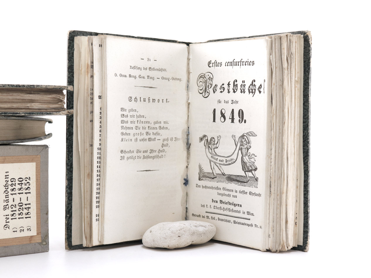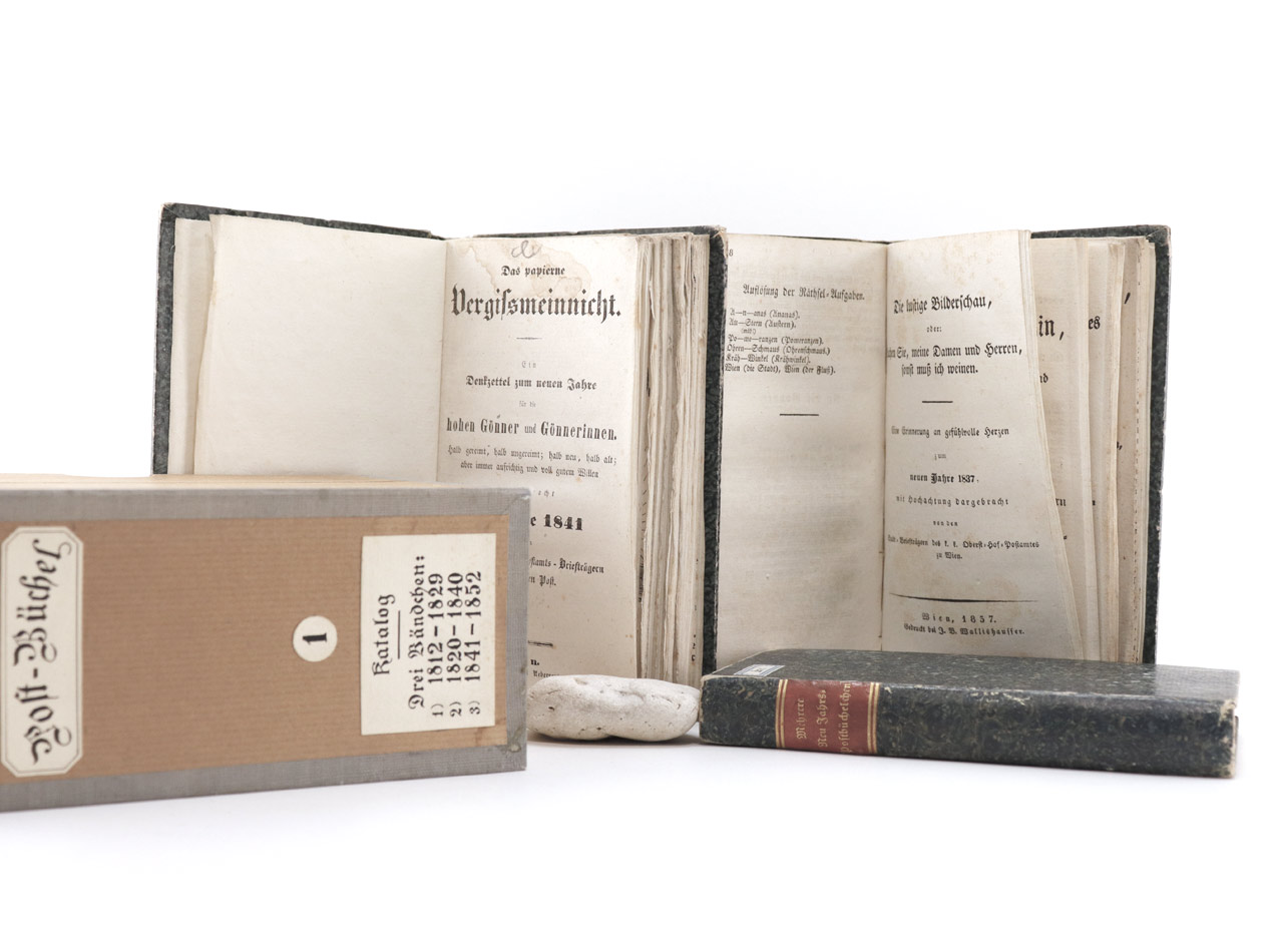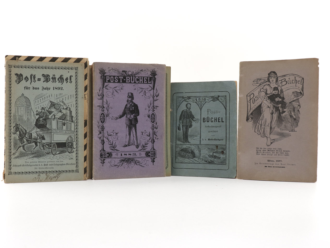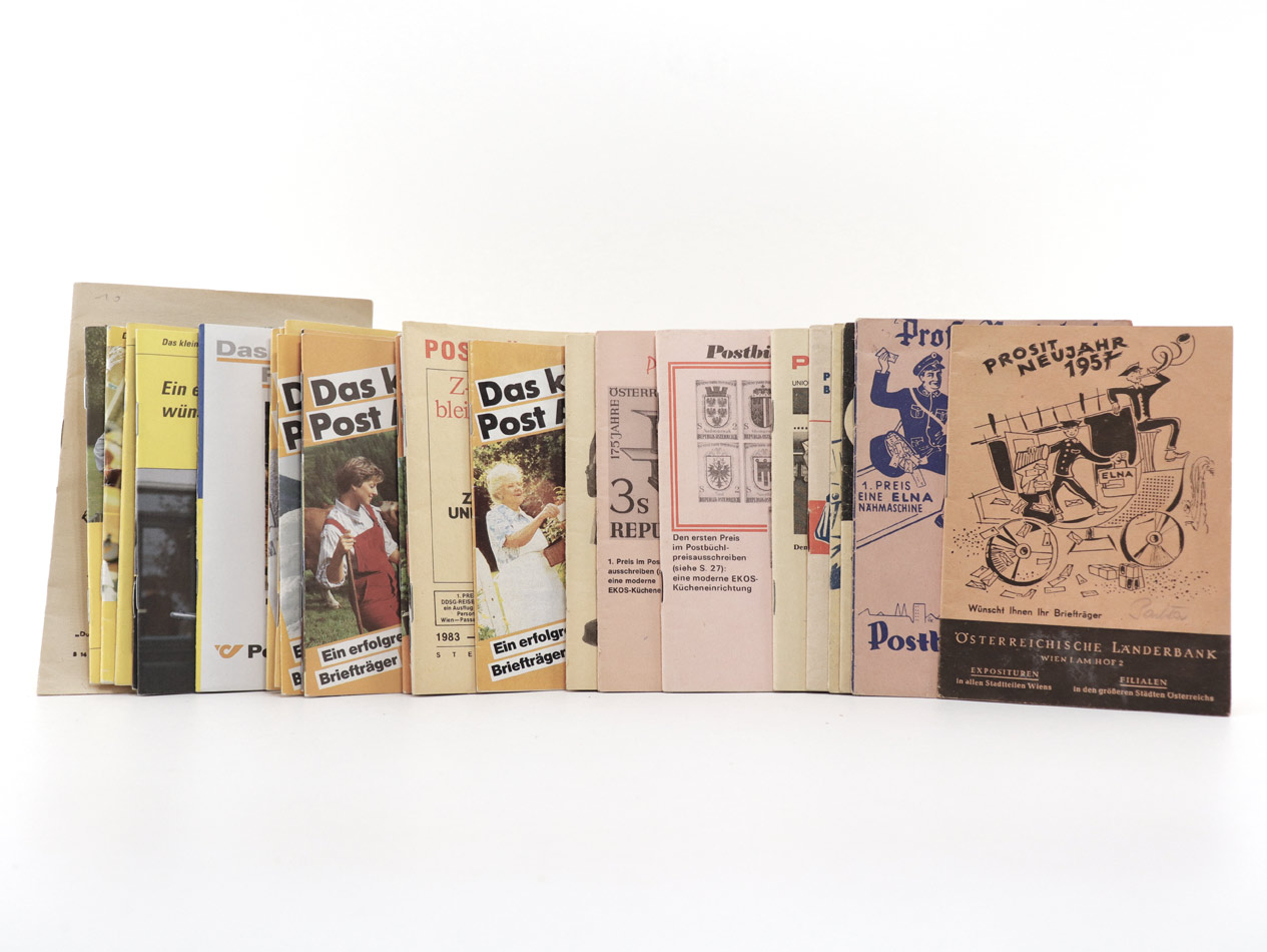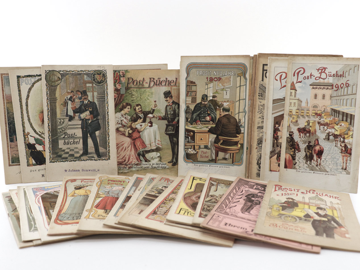 633 Postbucheln stammen aus dem Besitz des Botanikers, Vorstand des Wiener Botanischen Tauschvereins und Postkartensammlers Ignaz Dörfler. Die frühesten Postbücheln (Kassette 1) sind in 3 Bände gebunden. Die Prager Postbüchel sind "Dr. Schranka's Gelbbuch (früher Bertl's Postbüchel" . Von den übrigen 107 Postbücheln sind 30 nach 1957 . --- Als Postbüchel werden Neujahrsgaben bezeichnet, die die Wiener und auch Prager Briefträger ihren Kunden in Erwartung eines Trinkgeldes überreichten. Das erste erschien 1701. Von 1921 bis 1928 wurde das Postbüchel von der Postgewerkschaft verboten, da man der Ansicht war, die „Neujahrsbetteleien“ seien eines Staatsbediensteten unwürdig. Auch von 1938 bis 1953 erschienen keine Postbüchel.