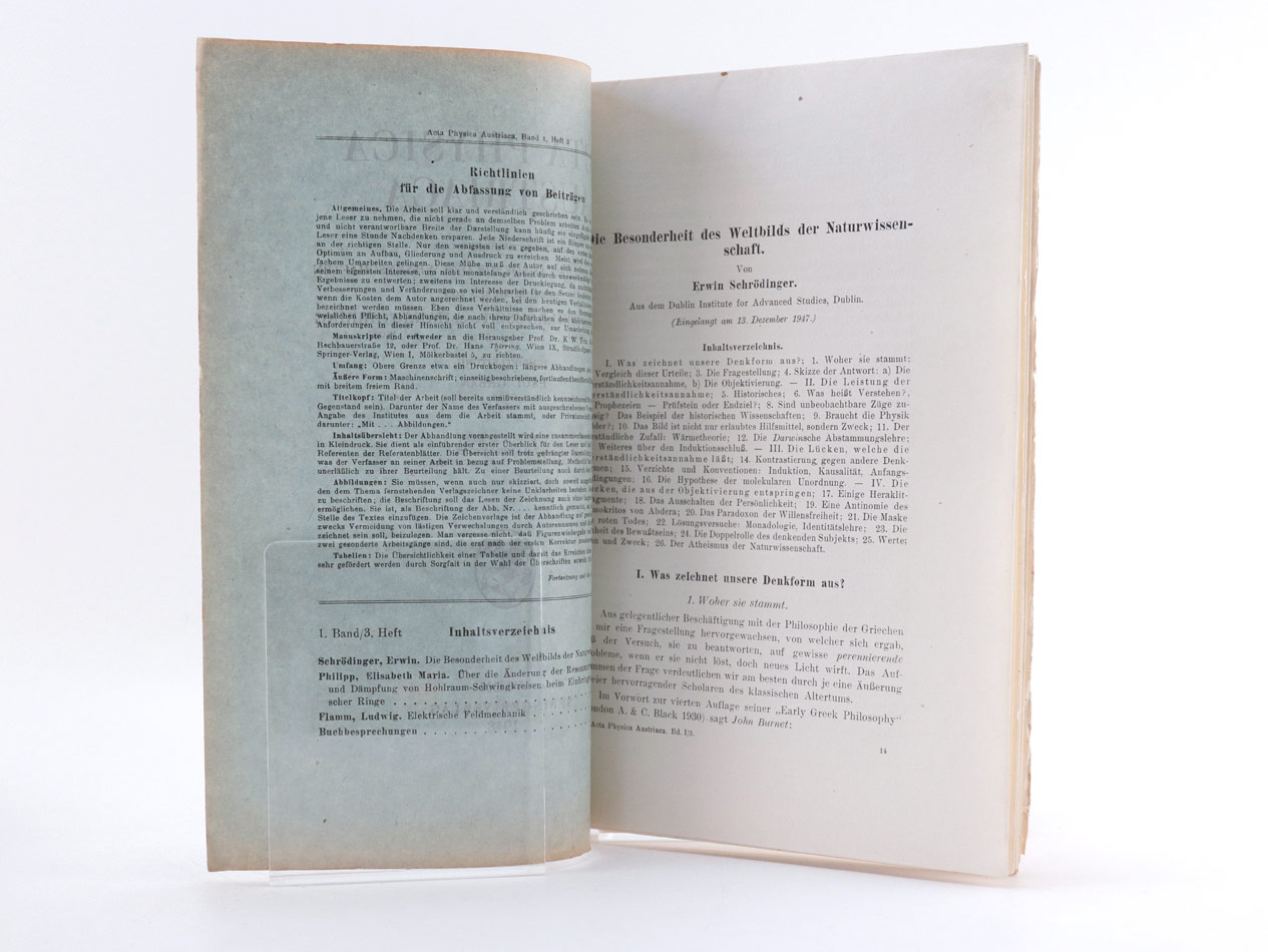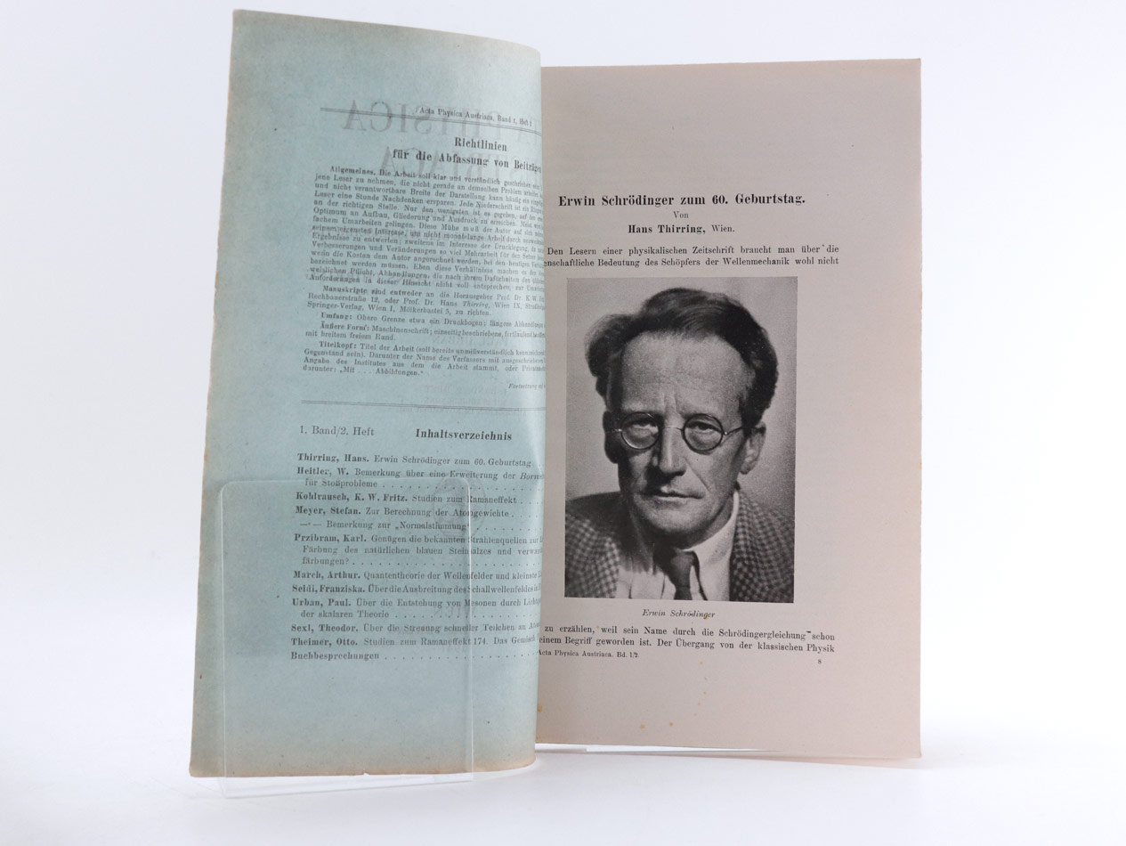 Schrödinger nennt vorliegenden Beitrag sein "wesentlichstes bisher veröffentlichtes philosophisches Bekenntnis". --- I. Bd. 2. Heft Beitrag von Hans Thirring: "Erwin Schrödinger zum 60. Geburtstag" mit Porträt Schrödingers.